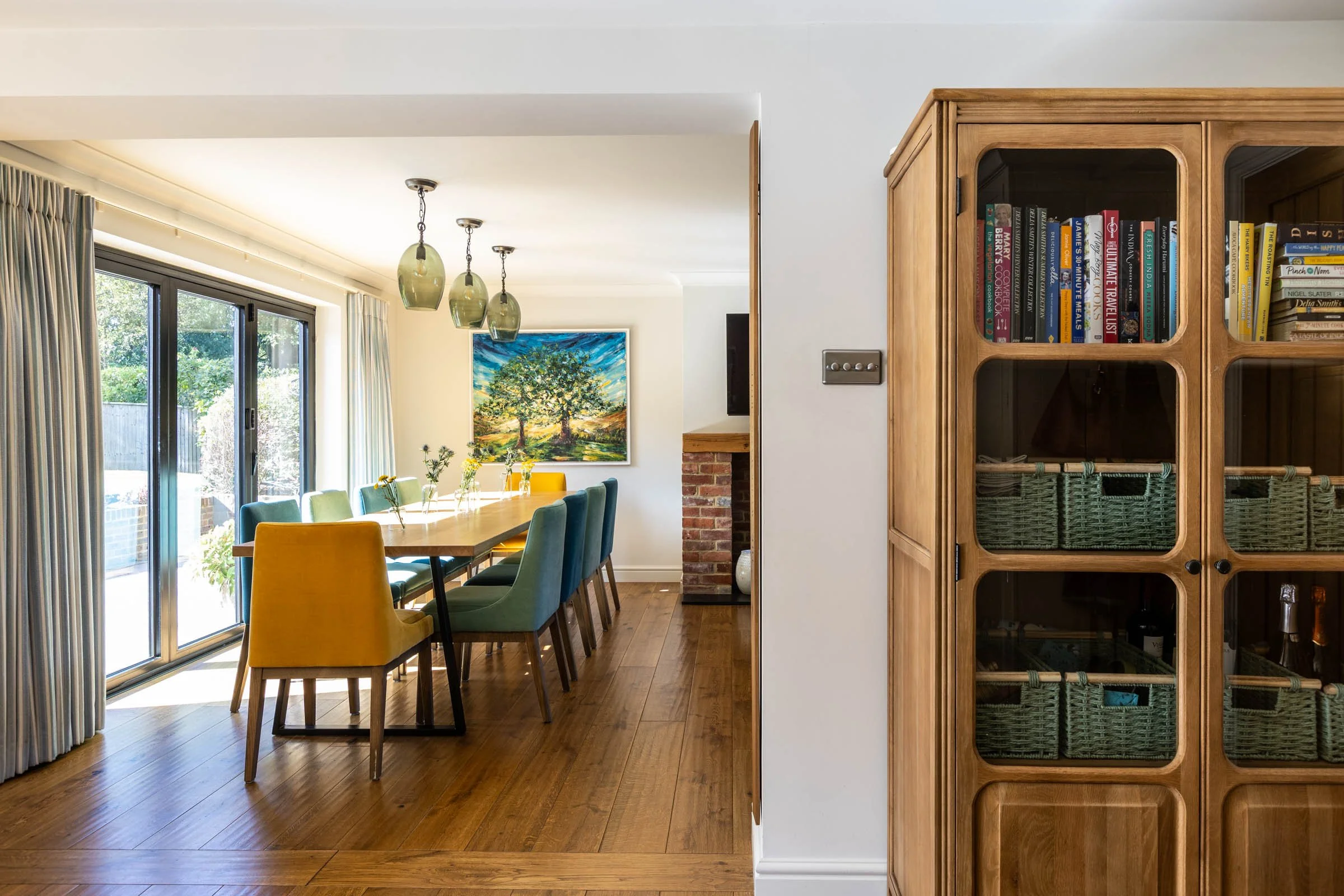 Between the kitchen and the dining/living area, a spare wall was creating a sense of dead space. We noticed that the sunlight streamed through into this corner, so we created a place to sit and enjoy it, by adding two contemporary wing-back armchairs in a sapphire blue. We extended the curtain stack behind the chairs to soften the space further and hide a utilities cupboard in the corner. An oak cabinet adds character and provides extra storage for the family’s large book collection.