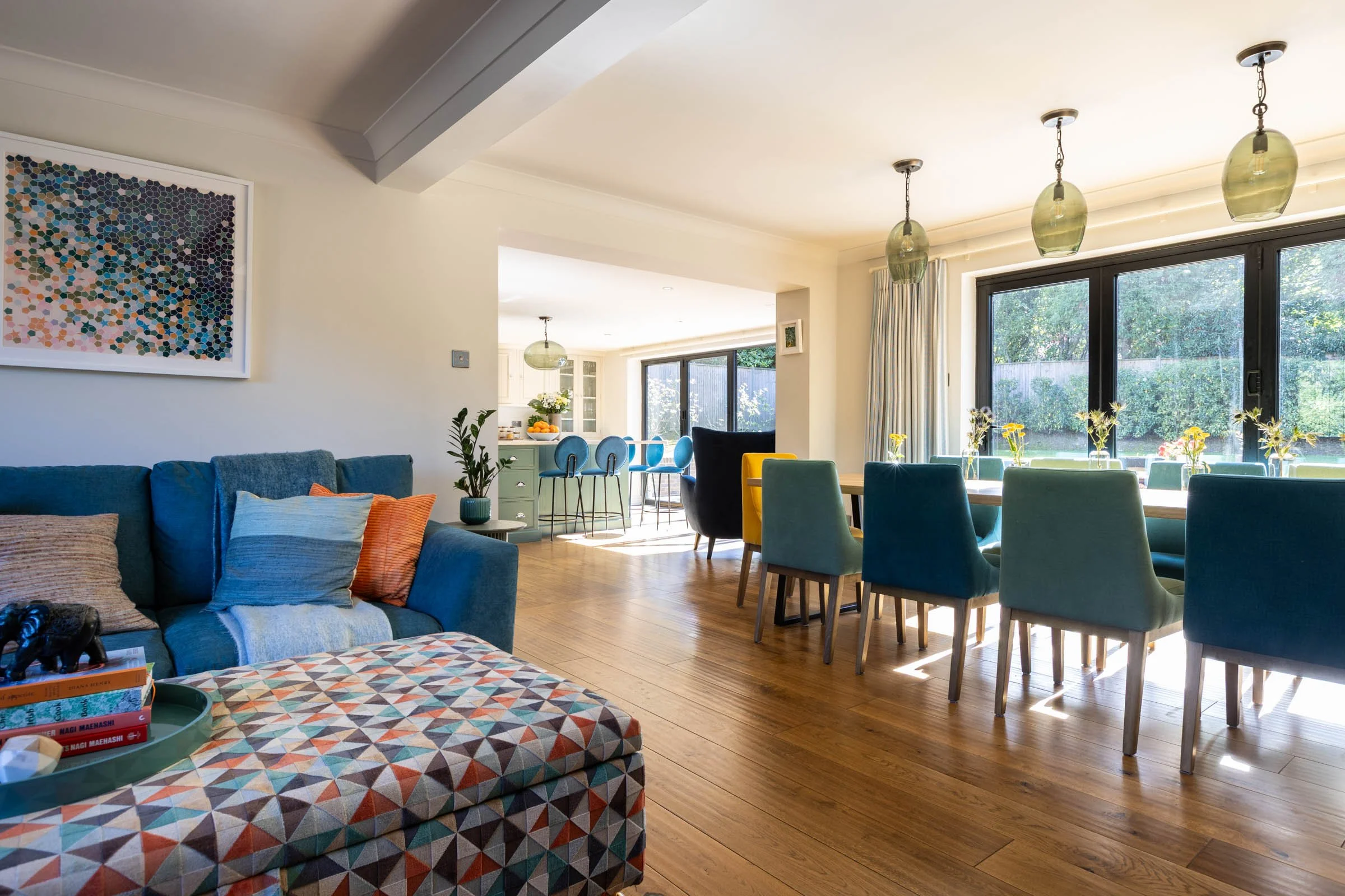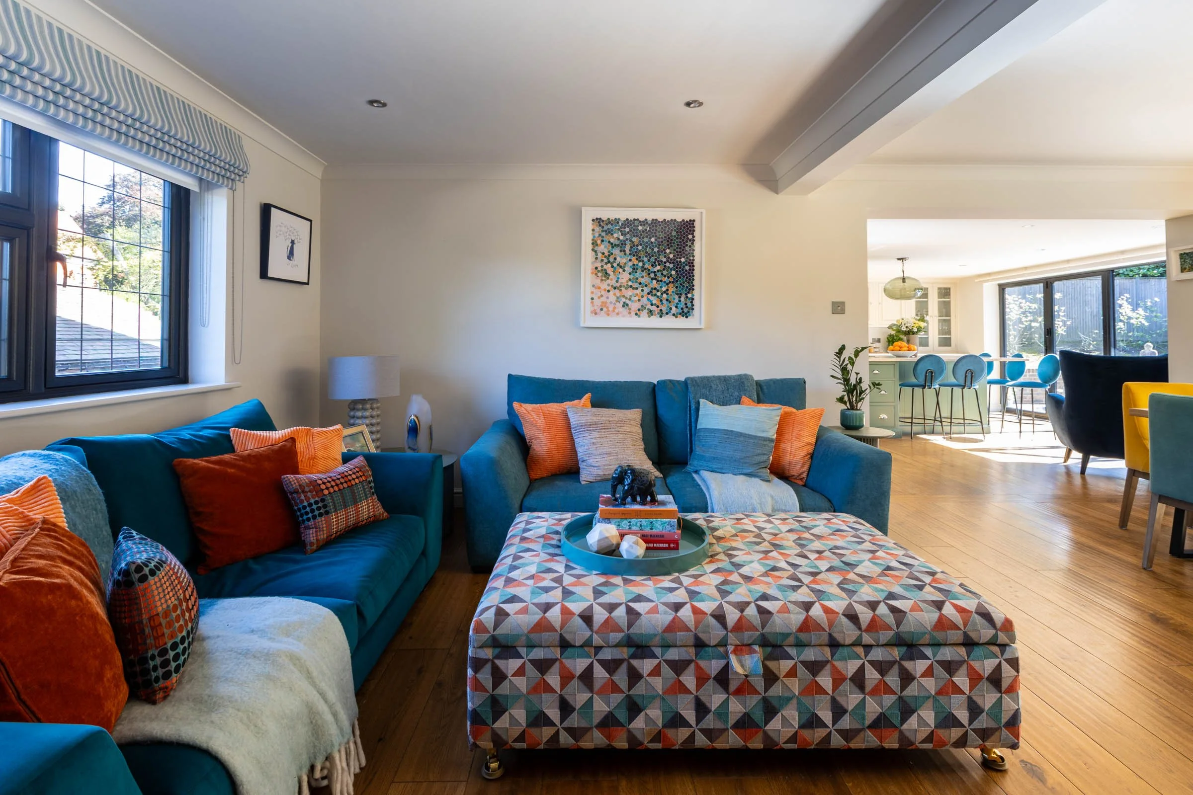A spacious, open-plan kitchen, dining and living area lies at the heart of this home. The kitchen was already fitted with neutral coloured Neptune cabinetry, so we focused on bringing character and warmth to what was already there. Painting the island in a soft green instantly gave the room a focal point. We sourced colourful stools with a small footprint so we could fit five, not four, around the island, and their sculptural backs introduced personality and playfulness. A patterned blind adds visual interest, and statement pendant lights completed the transformation, turning the kitchen into a welcoming, sociable space where the whole family naturally gathers.