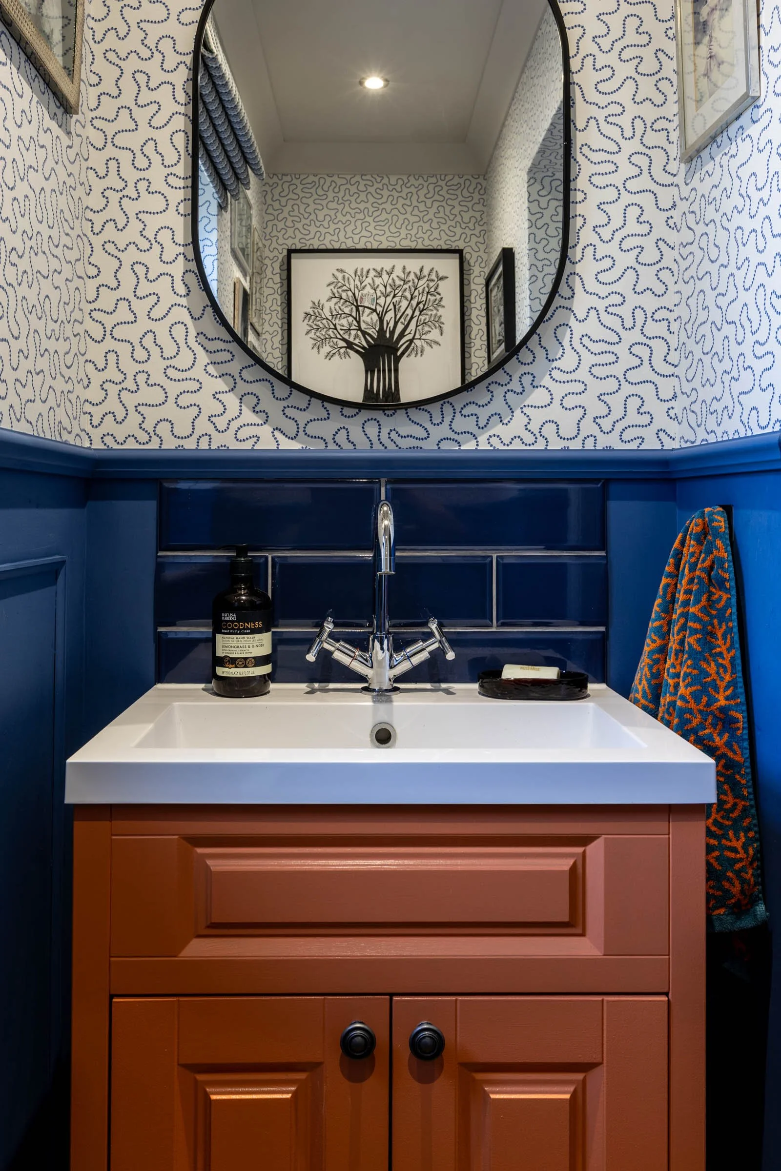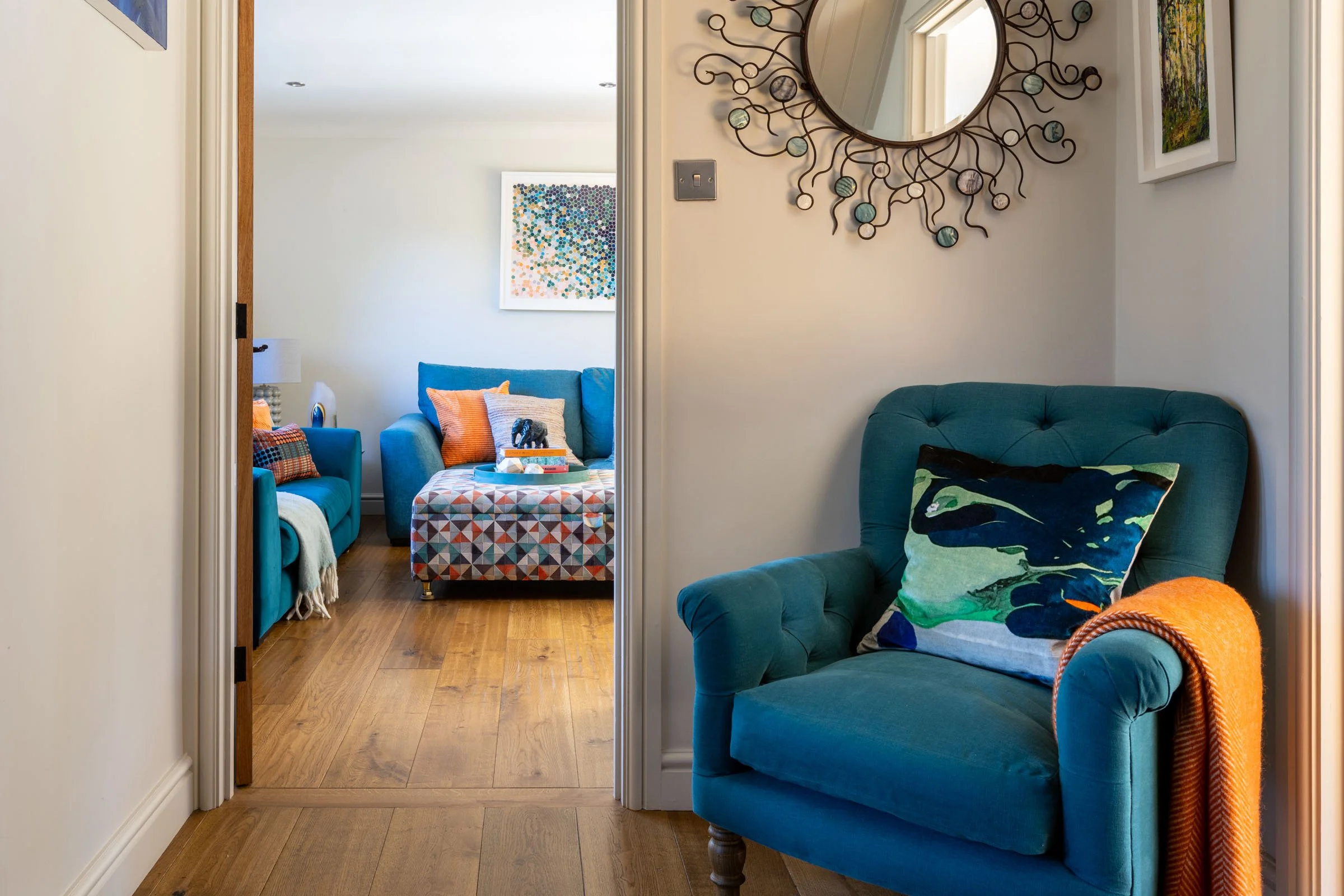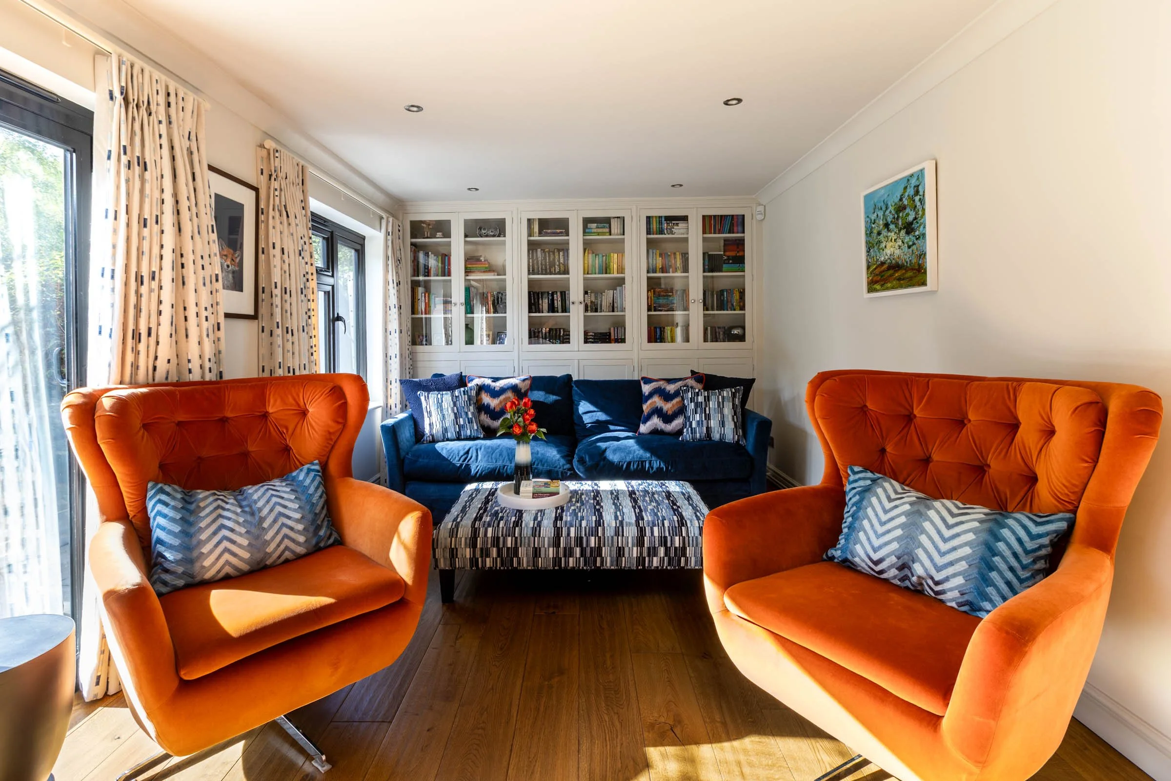The sitting room’s long, narrow shape made it awkward to furnish and difficult to use, so it was rarely enjoyed by the family. We reworked the layout to give the room not one but two clear functions. A bespoke bookcase now anchors the far wall, with long-term storage built in behind the sofa, and upper doors that open independently for easy access. This unit also helps to visually shorten the space. At the opposite end, a deep blue wall allows the television to recede, while echoing the tone of the sofa to create balance. Two orange swivel chairs bring a lively focal point to the center of the room and can turn to form an intimate seating area — or face the screen for family movie nights.