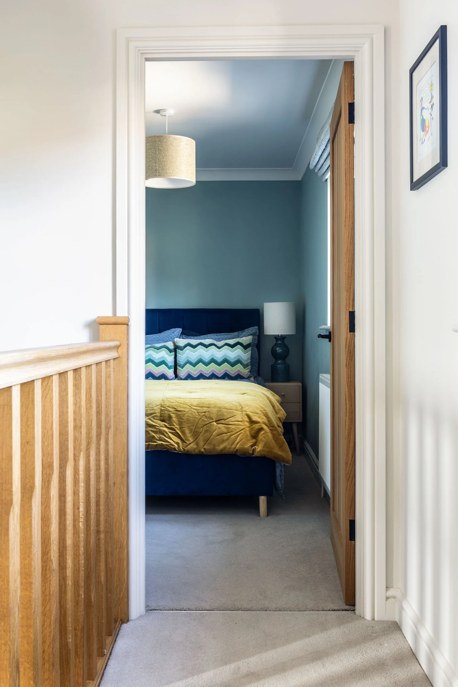 The guest room is small, so we chose a ¾ size bed to avoid it dominating the space. To keep things in balance, we scaled down bedside tables and lamps, using colour, pattern and texture to add interest and cosiness.